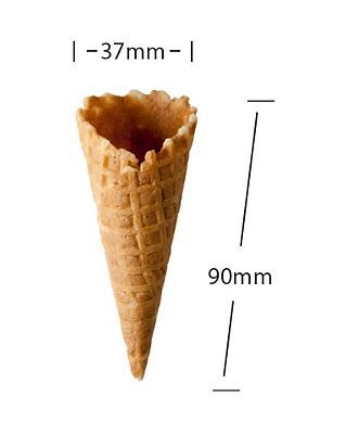 Cone shaped waffle of light golden brown colour with fresh baked characteristic odour and flavour and free from extraneous matter. Non GM by origin. All raw materials conform to the FSANZ Code. Ideal served with gelato or ice cream, also can be incorporated into canape dishes.