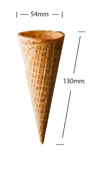 Cone shaped flat top waffle of light golden brown colour with fresh baked char-acteristic odour and flavour and free from extraneous matter. Non GM by origin. All raw materials conform to the FSANZ Code. Ideal served with gelato, sorbet, ice cream or any other dessert filling.