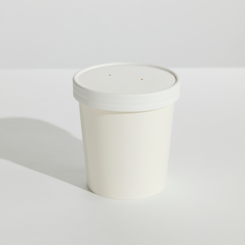 Paper Container 16oz Cup & Vented Lid White. Suitable for both hot and cold foods. Made from paper with PE coating inside. This PE coated paper is food grade, creating a water and grease-resistant layer that helps to keep food fresh. Various sizes available. Can be customised. MOQ 30,000.